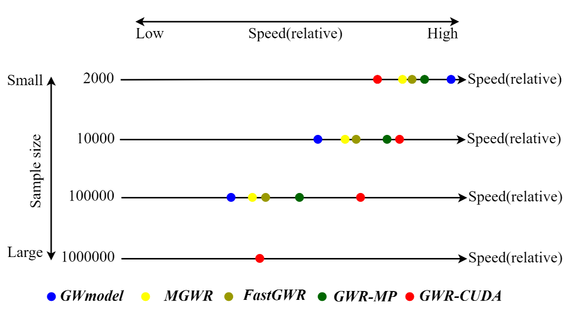 总的来说,当样本量小于1万时,用什么算法其实差距不是很明显,除了GWR-CUDA的性能会略微下降。当样本量在1万到10万之间时,GWR-MP的性能提升是最明显的。但当样本量进一步增加时,GWR-CUDA则是更好的选择。
