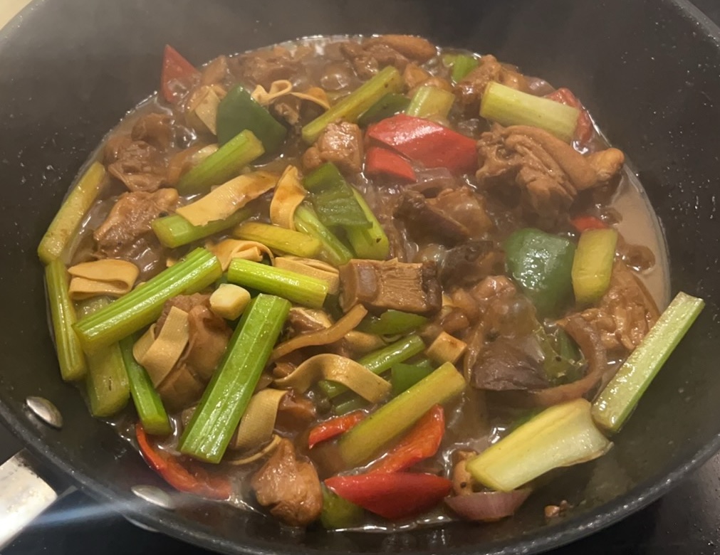# 食材 - 去骨鸡腿x4 # 步骤 - 鸡腿洗净擦干,切成 3cm 大小的丁 - 腌制鸡块 - 半茶勺十三香 - 一片香叶 - 半片白芷 - 几粒花椒 - 两勺柱候酱 - 一勺海鲜酱 - 三勺蚝油 - 半勺老抽 - 一茶勺鸡精 - 一勺食用油 - 配菜 - 青红辣椒 - 香芹 - 香菇 - 洋葱 - 大蒜 - 生姜 - 烧油,下姜片,煎至带一圈焦边 - 放三分之一块火锅底料 - 火锅底料融化后,下入鸡肉翻炒大约 4 分钟 - 加入 5 勺清水,转小火焖 3 分钟 - 倒入配菜,转大火翻炒 1 分钟 - 如果要带汤,加入热水,水开之后倒入其他配菜